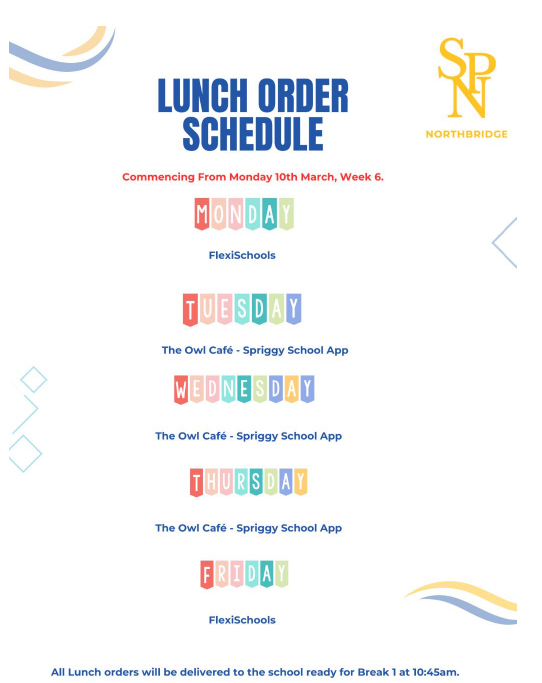 Spriggy Schools – Reliable Online Canteen Ordering working closely with our community lunch can also be ordered Tuesday, Wednesday and Thursday from Owl Cafe in Northbridge. Please use the Spriggy school app for these orders that are delivered fresh to the school at 10:40am for Break 1.